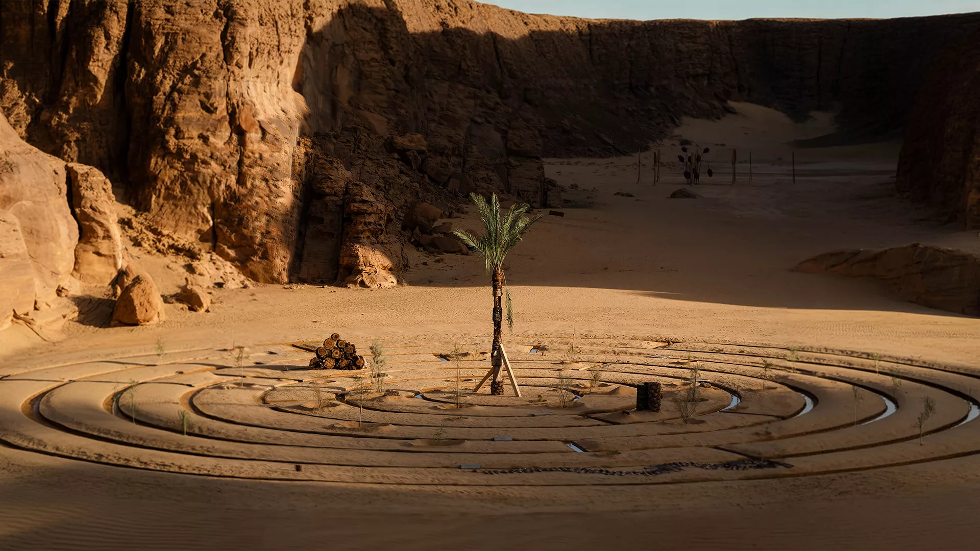 This emphasis on activation continues in Hector Zamora’s Tar HyPar (2026). Mexican-born Zamora, whose practice blurs boundaries between art and architecture and between the organic and the industrial, conceived the work as a site-specific instrument for the valley. Drawing its name from the traditional Saudi drum (tar) and the hyperbolic paraboloid form (hypar), the installation invites visitors to play its surfaces as drums, transforming viewers into participants and the desert itself into a resonant, communal soundscape.